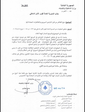 وجه وزير الداخلية والبلديات في حكومة تصريف الاعمال القاضي بسام مولوي كتابا، الى المديرية العامة لقوى الأمن الداخلي "لمنع التظاهر من قبل النازحين السوريين والتظاهرات المضادة لها، بحيث ان الدعوة لهذه التظاهرات قد تؤدي الى حدوث إشكالات أمنية بين المتظاهرين في نطاق المناطق التي ستقام فيها".