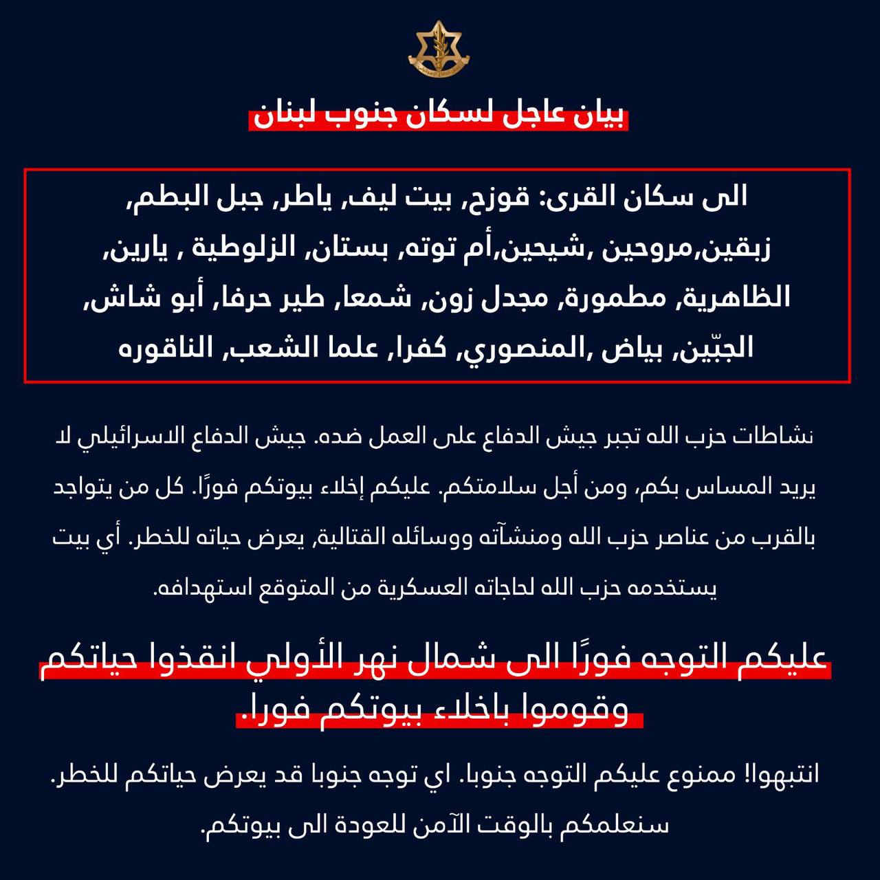 بيان عاجل إلى سكان #جنوب_لبنان في القرى التالية:
