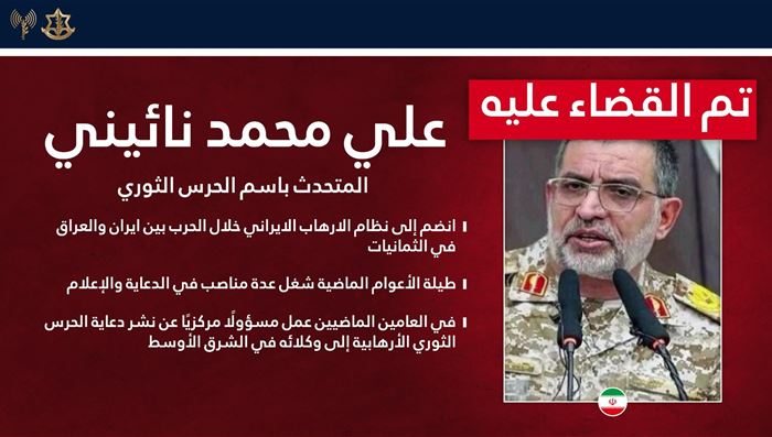 وقال الجيش إن العملية جرت بتوجيه من الاستخبارات العسكرية، مشيراً إلى أن نائيني شغل خلال السنوات الماضية مناصب في مجالي الإعلام والدعاية، وكان يُعد من أبرز المسؤولين عن الترويج الإعلامي للحرس الثوري.