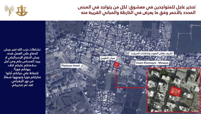 وجّه الجيش الإسرائيلي تحذيراً عاجلاً إلى سكان جنوب لبنان، ولا سيما في مناطق معشوق، صور، وبرج الشمالي، داعياً إلى الإخلاء الفوري.